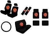 15 Piece Auto Interior Gift Set - Football Manchester United - 2 Front Seat Covers (2 Front and 2 Bottom), 2 Headrest Covers, 2 Seat Belt Shoulder Pads, 1 Steering Wheel Cover, 1 Bench Seat Cover (1 Top and 1 Bottom), 4 Floor Mats (2 Front and 2 Rear)
